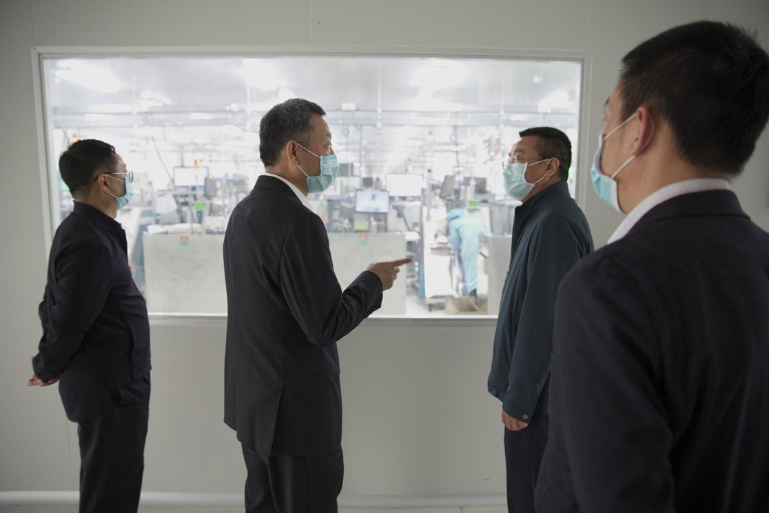 王祥明总经理一行实地考察了生产车间,了解了车间的封闭情况、空气循环、净化级别等情况。在听取防疫措施和复工复产报告时,王祥明总经理详细询问并了解数据来源、措施执行效果等,并强调严格按照政府管控要求执行各项工作。